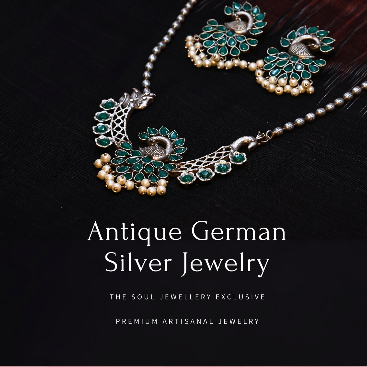 Elephant Motif Oxidized Silver Replica with Green Stones and Pearl Drops GSE400GREEN
