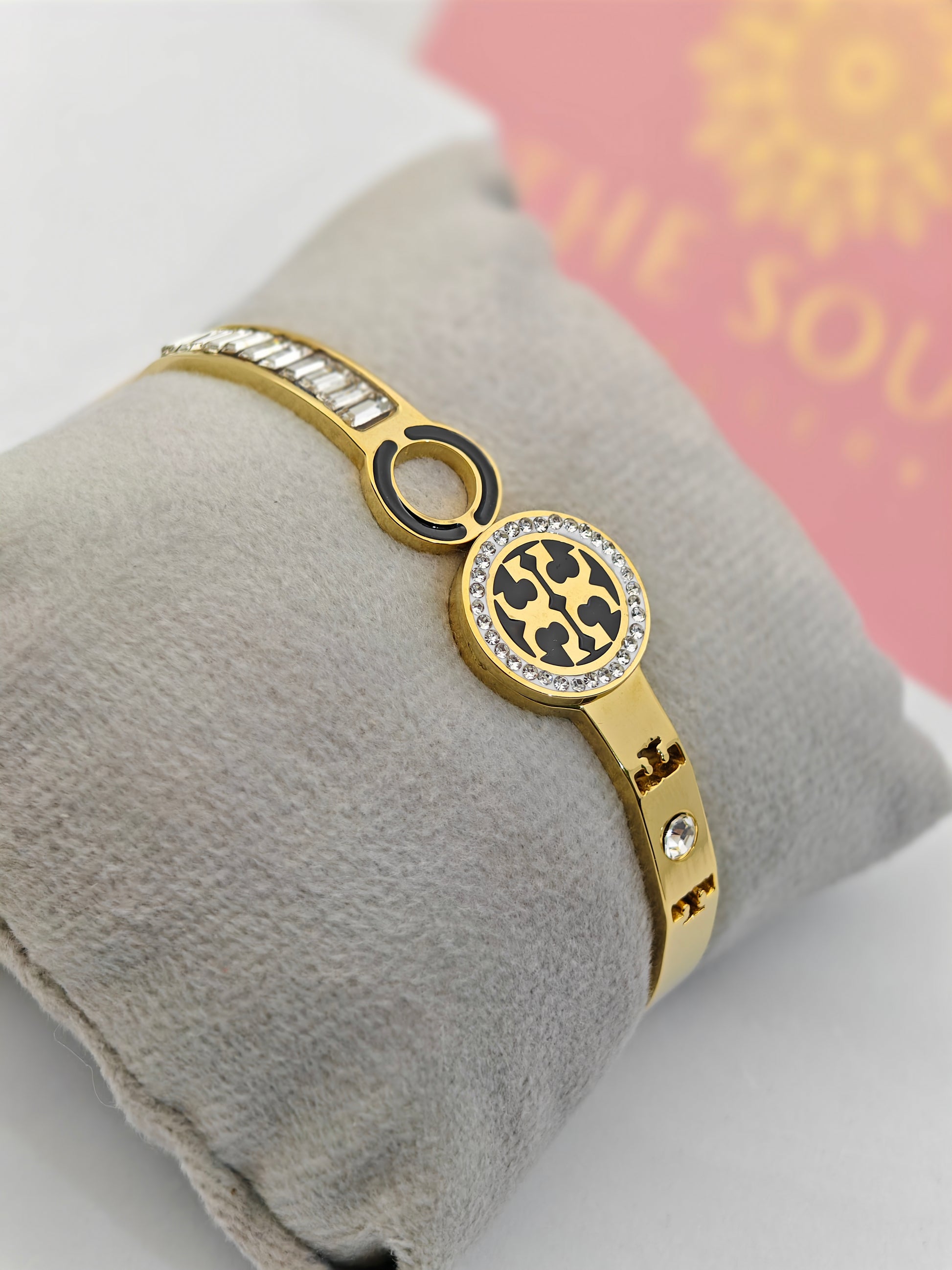 The bracelet is available in size 2.2 to 2.8, offering a comfortable fit for every wrist while maintaining a luxurious, designer feel. The iconic Troy logo engraving, accented with sparkling crystal embellishments, adds a touch of sophistication that reflects your confidence, style, and inner power.