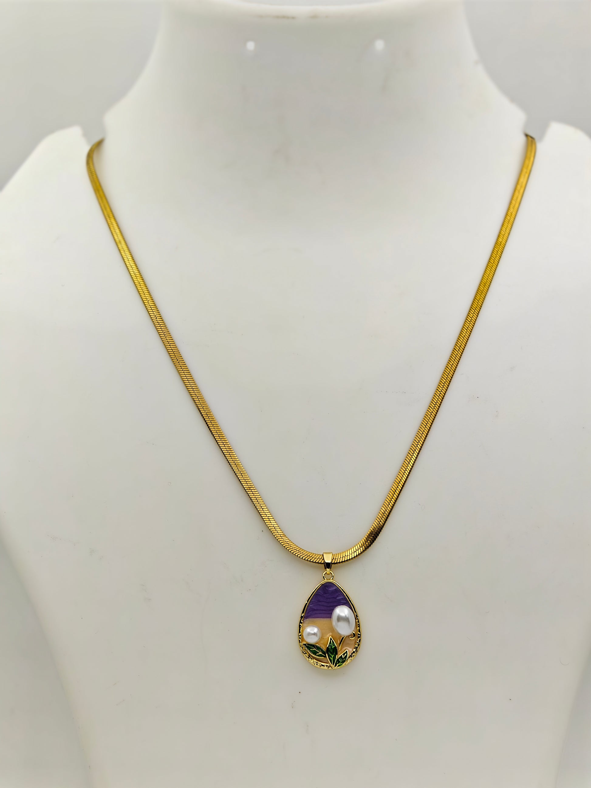 This stunning pendant features a hand-enamelled purple bloom, symbolizing intuition and prosperity, paired with luminous pearls that represent purity and abundance. Set in a rich 18K gold-plated, anti-tarnish chain, this necklace stays shiny and beautiful for years — just like the intentions you carry.