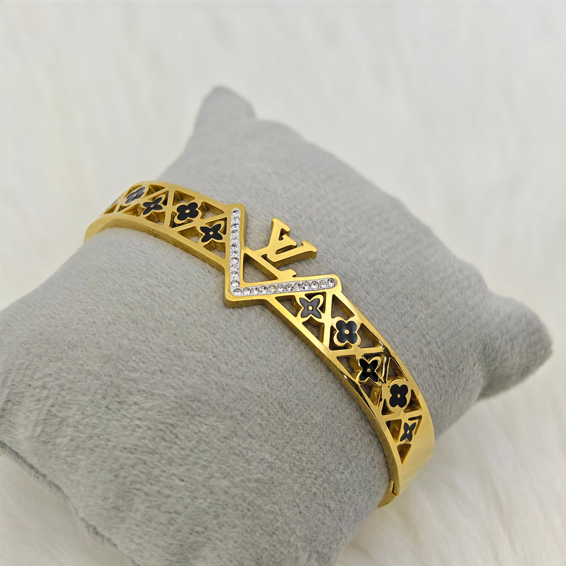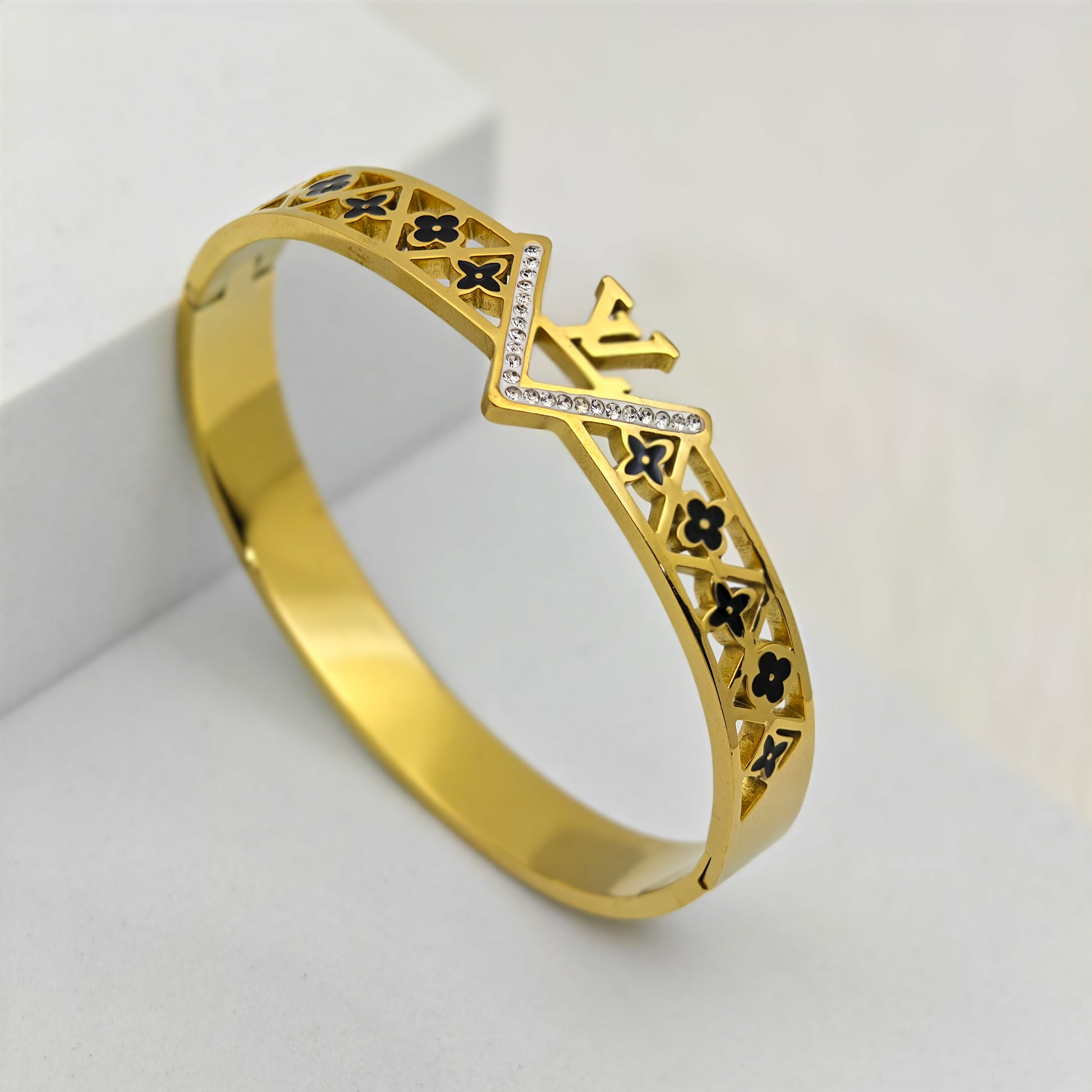 Luxury 18K Gold-Plated LV-Inspired Bracelet β Anti-Tarnish Stainless Steel Bangle with Crystal Accents & Floral Cutout Design RGB422