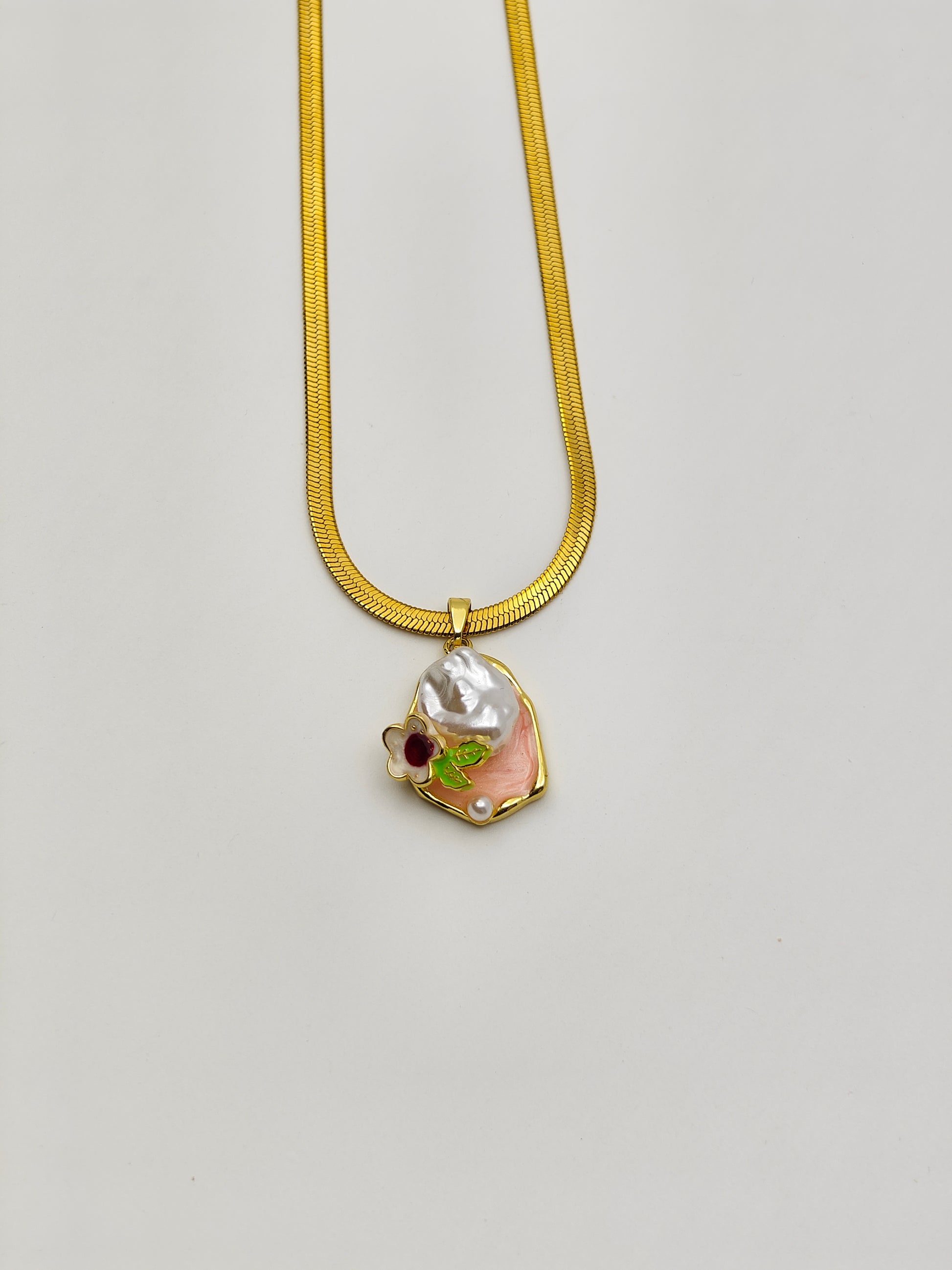 Its pastel blush enamel combined with green leaf detailing and petite pearls makes this piece an instant favourite among women who prefer meaningful, elegant jewellery.