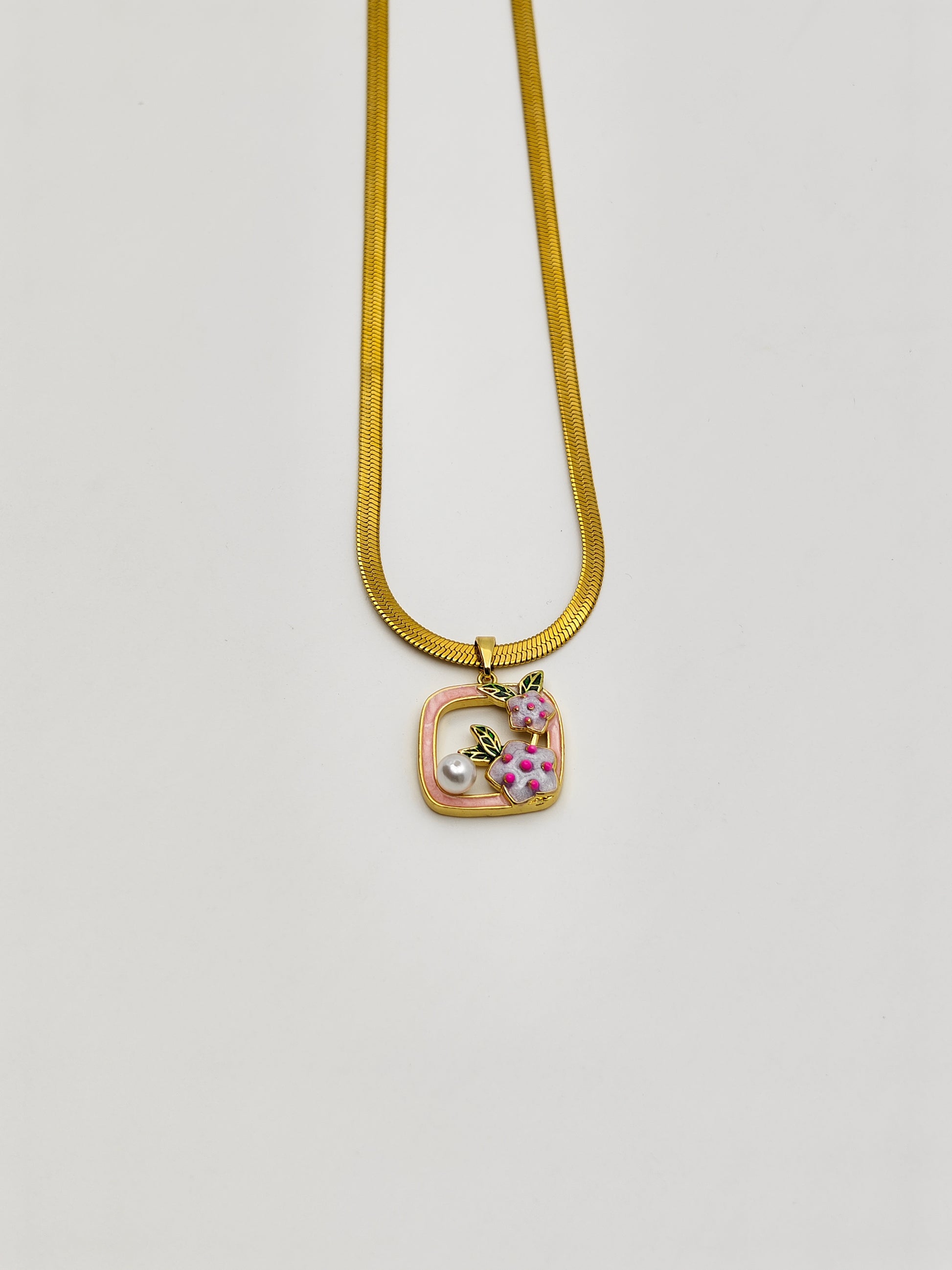 This enchanting square pendant features handcrafted pink floral enamel detailing, paired with lush green leaves, a lustrous pearl accent, and a soft pastel frame. The design reflects fresh beginnings, beauty, growth, and feminine grace, making it a timeless daily wear piece.