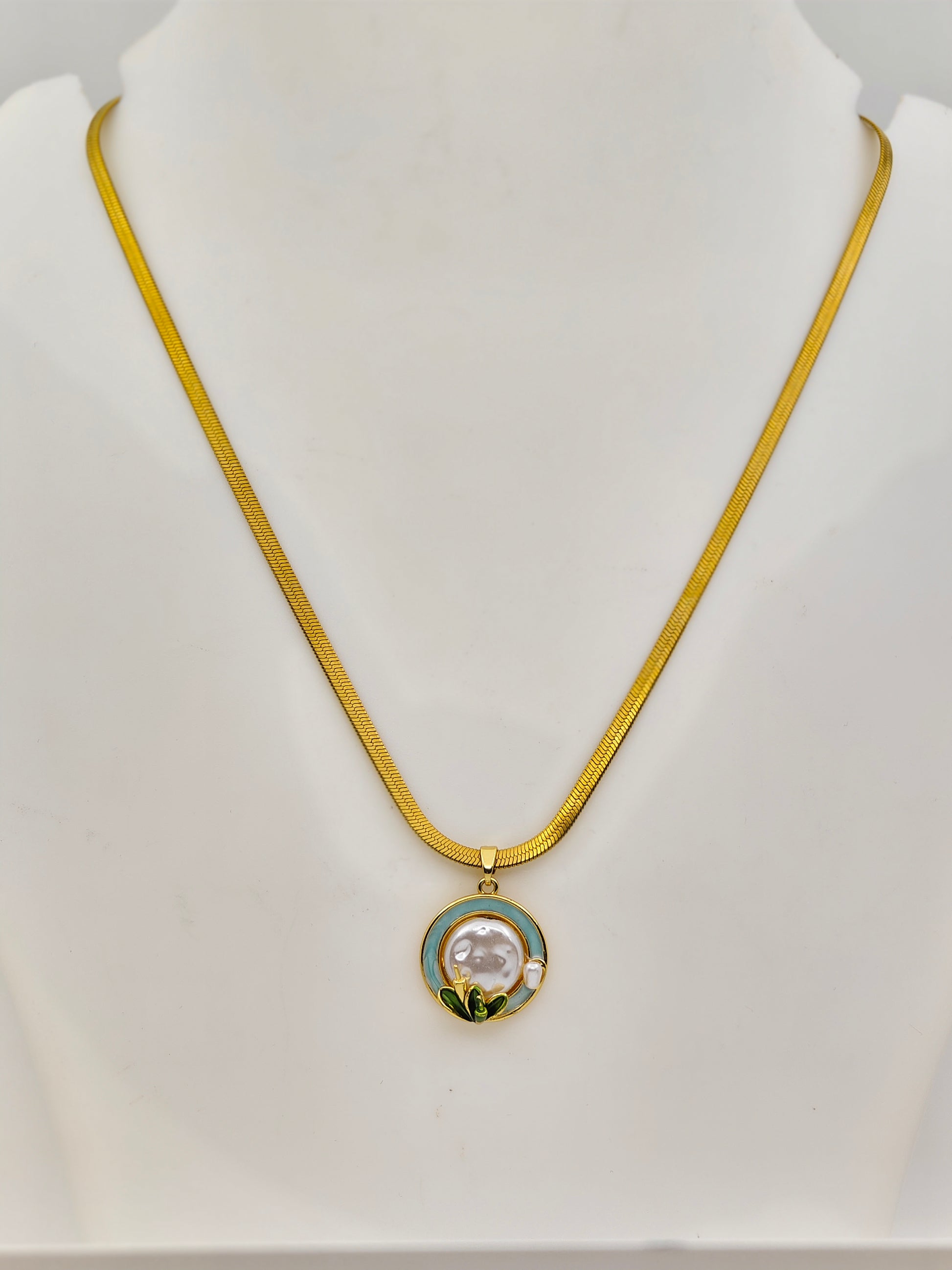This enchanting pendant features a mother-of-pearl–inspired moon embraced by delicate floral motifs and lush green enamel leaves, symbolizing new beginnings, growth, and feminine beauty. The soft aqua background radiates calmness, purity, and emotional balance—making it a meaningful piece to wear every day.