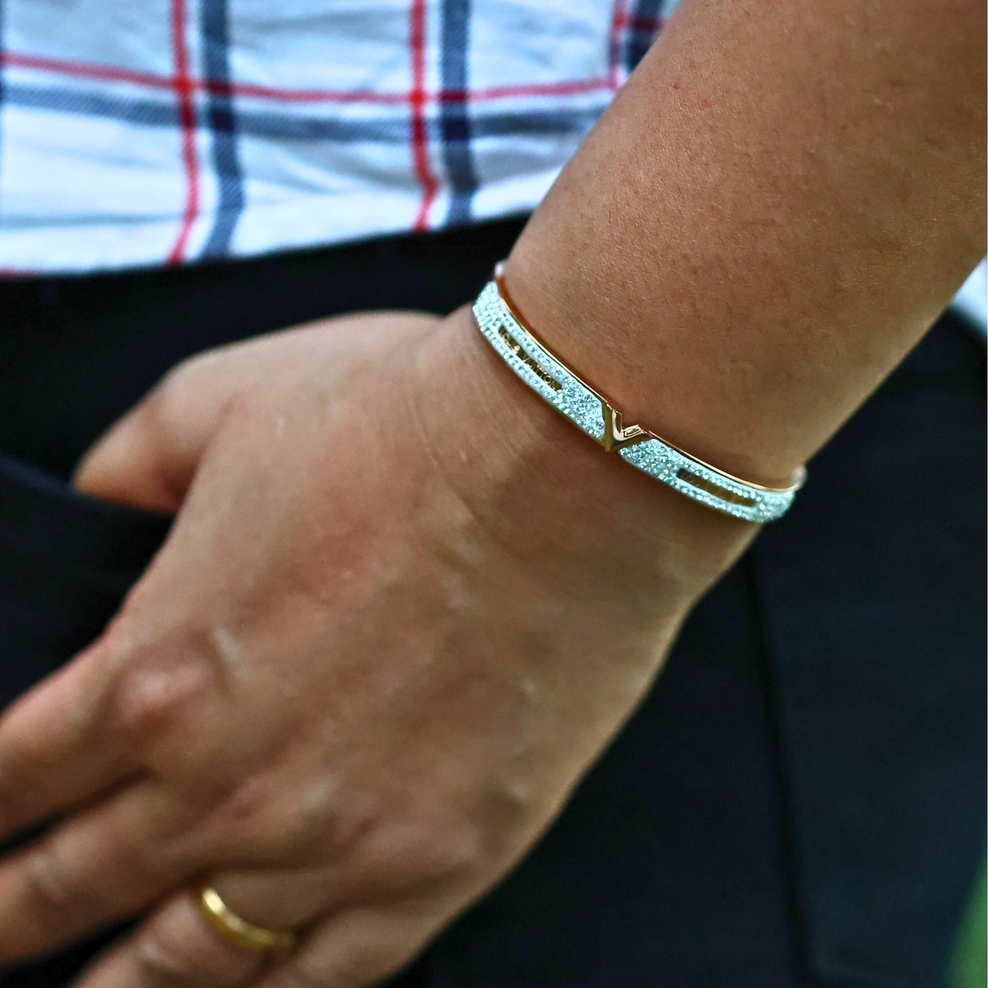 The bangle features cubic zirconia stones that sparkle like the stars aligning in your favor. Their brilliance catches and reflects light from every angle, creating a dazzling display that mirrors your victories.